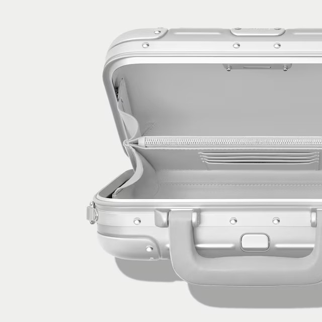 Внутренняя отделка из цельной зернистой итальянской кожи включает 2 открытых отделения, 1 отделение на молнии, 4 слота для карт и украшена логотипом RIMOWA и координатами.